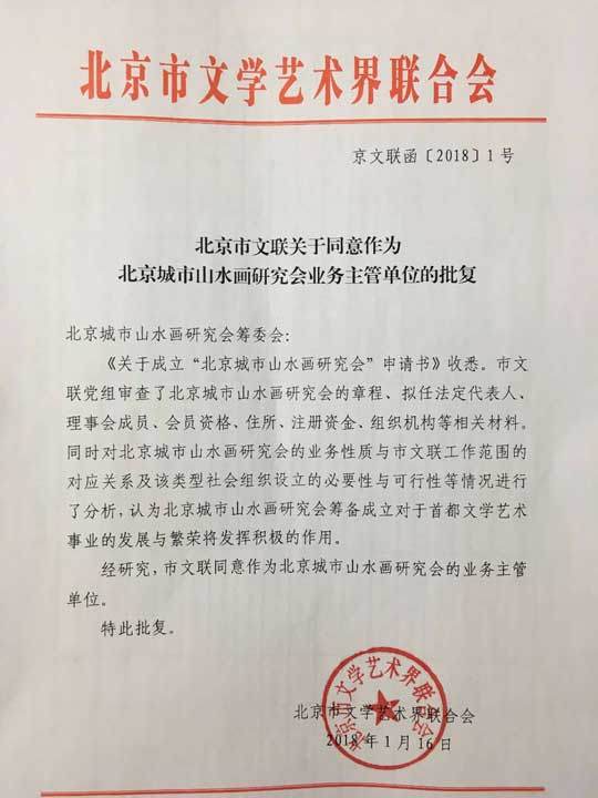 北京城市山水画研究会于二〇一八年一月十六日由业务主管单位北京市文学艺术界联合会同意成立批复,经北京市民政局审核通过,于二〇一八年九月三日批准正式成立。本会以研究会章程为活动宗旨,在文联规定的工作范围内进行业务活动。